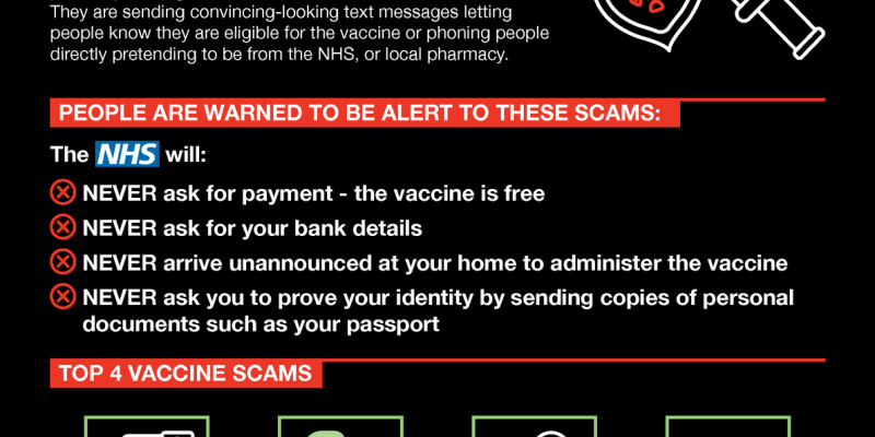 Criminals are using the COVID-19 vaccine as a way to target the public by tricking them to hand over cash or financial details. They are sending convincing-looking text messages letting people know they are eligible for the vaccine or phoning people directly pretending to be from the NHS, or local pharmacy.